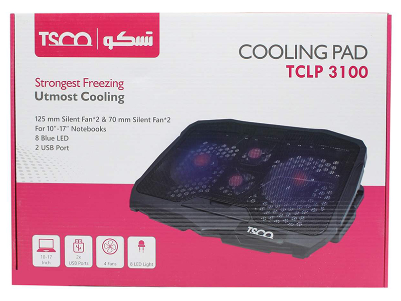 TSCO TCLP 3100 Coolpad یکی از پایههای خنککننده کارآمد برای لپتاپها است که با بدنهای ترکیبی از فلز و پلاستیک مقاوم طراحی شده و از لپتاپهای تا سایز ۱۷ اینچ پشتیبانی میکند. این کولپد دارای ۴ فن خنککننده شامل دو فن بزرگ ۱۲۵ mm و دو فن کوچک ۷۰ mm است که با سرعت حدود ۱۵۰۰ دور در دقیقه جریان هوای مناسبی را زیر دستگاه ایجاد میکنند و به کاهش دمای قطعات داخلی کمک میکنند.
